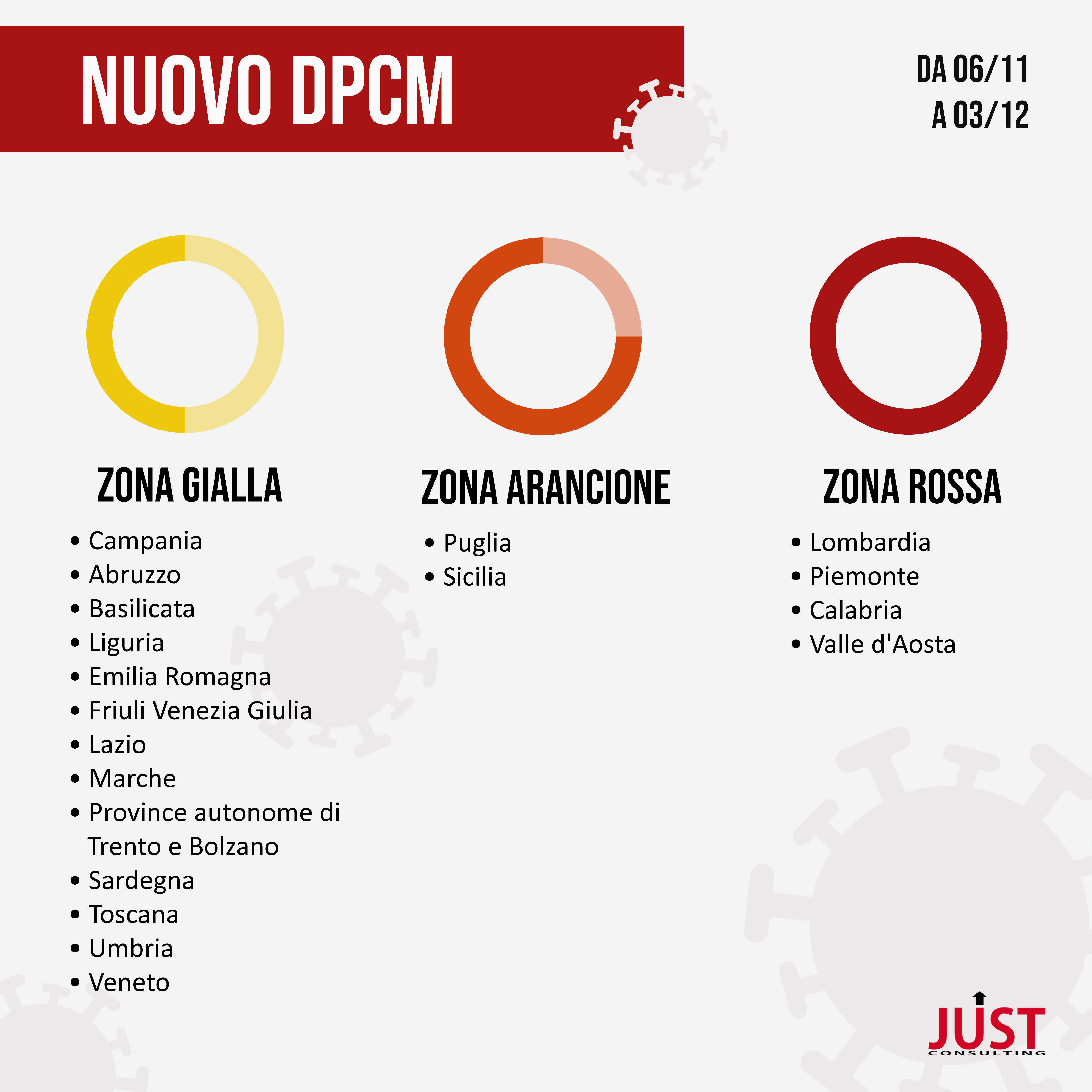 Il nuovo Dpcm, divide l’Italia in 3 aree ben diverse in base alle zone di rischio così definite: rosse (rischio elevato), arancione (rischio intermedio), giallo (rischio minore). Il nuovo Dpcm prevede delle restrizioni generali valide su tutto il territorio regionale (le sole imposte nelle zone gialle) e divieti via via più restrittivi per la zona arancione e rossa.
